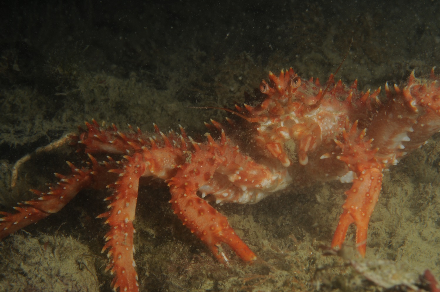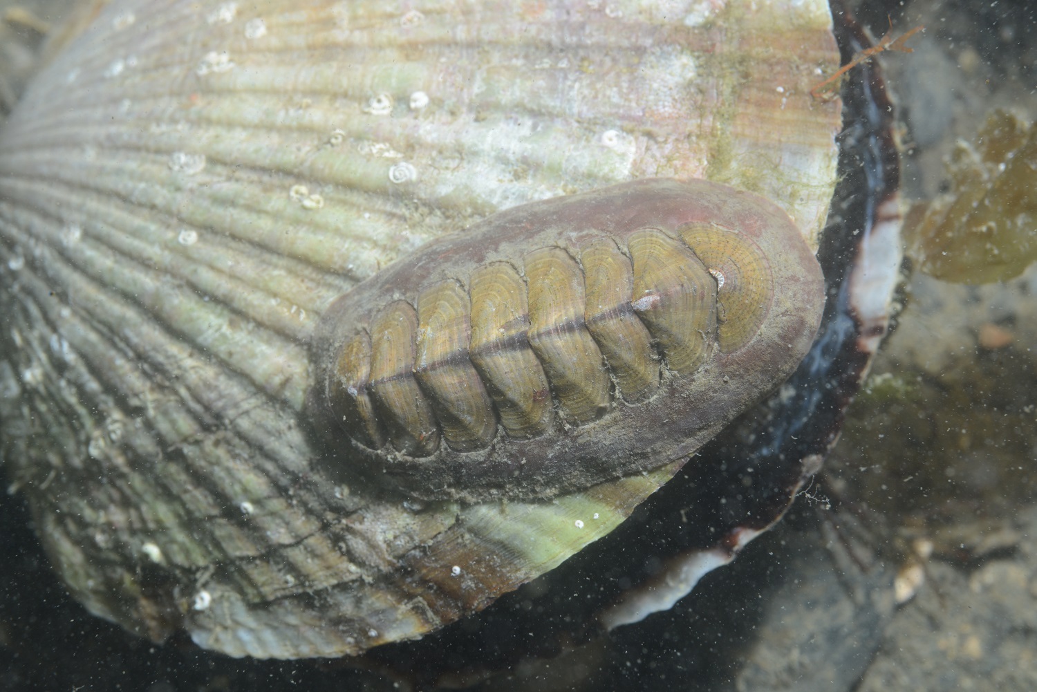 Izquierda, Phylum mollusca; clase bivalvia (ostión) con un chiton encima. (Mollusca; polyplacophora) en el islote Albatros. Centro. Phylum arthropoda; clase malacostraca; especie Lithodes santolla (centolla) @Mateo Cáceres. Derecha. Phylum: arthropoda; clase malacostraca; especie Paralomis granulosa (centollón) @Dirk Schories
