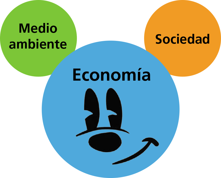 Quizás por la ineficacia en reflejar estas interdependencias, el modelo de triple beneficio en que las tres esferas tienen igual peso ha derivado en el modelo de sostenibilidad de “Mickey Mouse”. En este modelo, la economía es el objetivo primordial y, si y solo si, (en negrita y subrayado) la economía es vigorosa, podemos preocuparnos de avanzar hacia una sociedad justa y un medio ambiente saludable. Si la economía cae, estas preocupaciones serían una especie de “lujo” que no podemos darnos.