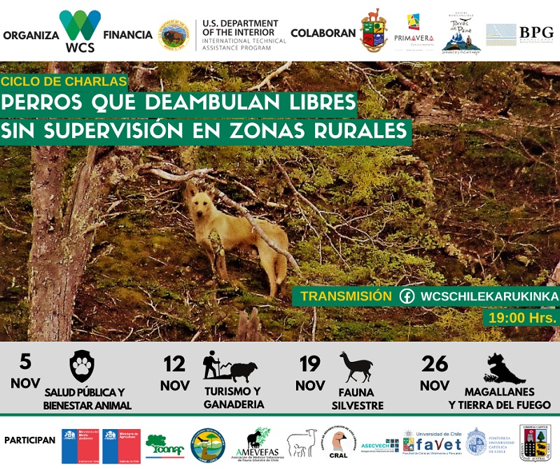 Producto de este proyecto, WCS Chile organizó y transmitió un ciclo de conversaciones sobre la temática, cada jueves de noviembre, desde las perspectivas de salud humana y bienestar animal, turismo y ganadería, conservación de la biodiversidad y la experiencia desde Tierra del Fuego, con una veintena de expertos y expertas en estas materias. Accede a las grabaciones del "Ciclo de Conversaciones: Perros que deambulan sin supervisión en áreas rurales".