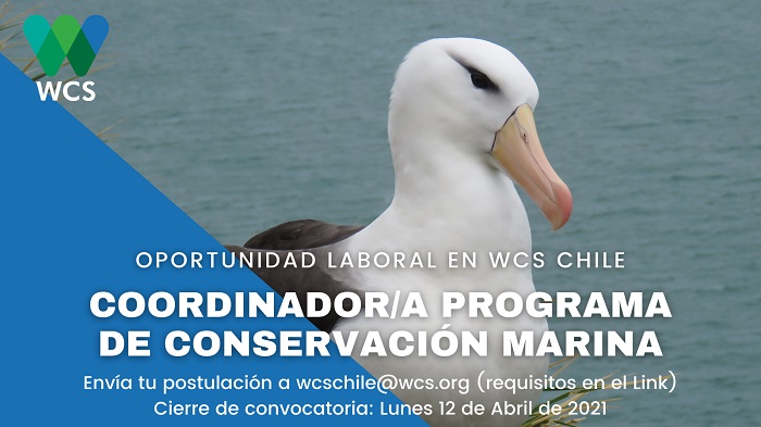 Wildlife Conservation Society (WCS) – Chile hace un llamado para postular al cargo de Coordinador/a para su Programa de Conservación Marino. A través de esta posición, WCS busca desarrollar actividades de gestión, manejo y difusión basadas en ciencia para la conservación del Mar en Chile, derivada de los planes y estrategias que WCS tiene tanto a nivel global como local.